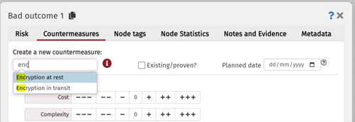 When you create a new countermeasure, start by typing the name. As you type the name, if it matches any of the countermeasures in the loaded libraries, the names will be suggested in a drop-down beneath the name field. You can select by clicking on the name – or you can ignore the suggestion and continue typing.