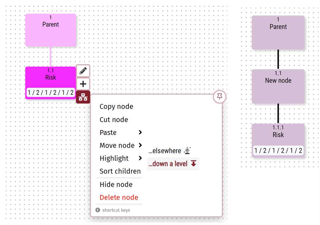 Sometimes you might need to insert an node at a level between two existing nodes. For example, in the tree below left, we need to add a new node between the 'Parent' and 'Risk' nodes, we would click on the 'Risk' node and select  Move node…down a level  (below centre). This will insert a new node (called 'New node') between the existing nodes (below right). The node editor will be opened automatically so that you can set the name for the new node.