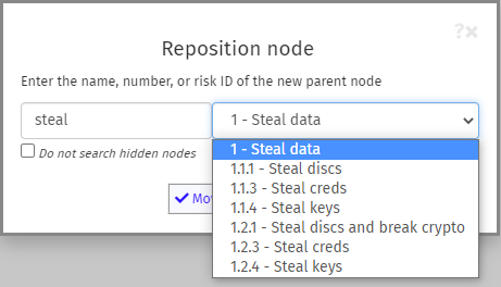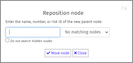 In the left-hand field, start typing the name, node number, or risk ID of the node under which the current node is to be placed. The right-hand drop-down field will dynamically change to show all matches: