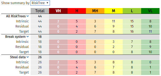 By default it shows them by type; these can be split by RiskTree by clicking on the blue chevron () next to the risk types. This will show the risks of that type by RiskTree, via extra rows on the table. The example below has expanded the Residual risks to show these by the two RiskTrees that were loaded.