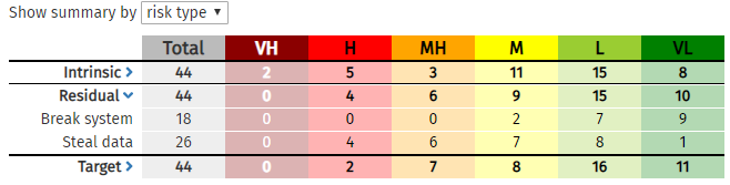 The risk summary provides a breakdown of your assessed risks by risk type (intrinsic / residual / target) and by RiskTree (if you have loaded multiple trees into the Processor).