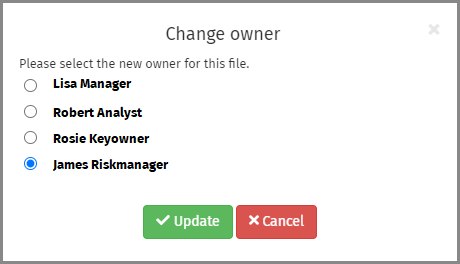 The dialogue box contains a list of all users within your organization, with your name selected. Click on the radio button beside the person to whom you are transferring ownership, and click the button.