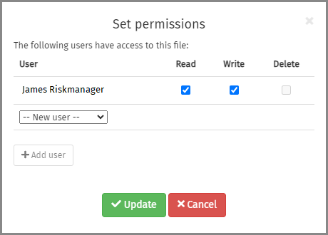 All users who currently have permissions on this file will be listed. You can change the permissions by ticking and unticking the Read and Writecheckboxes. To add a new user from within your organization, choose a user from the drop-down and click on the . This will add them in a new row beneath the existing users, and you can now set their permissions. To delete a user, tick the Delete checkbox in their row. Their name will be crossed out in red to show that they will no longer have access to the file. Note that it is not possible to delete the file owner.